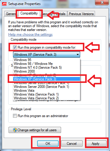 -Select compatibility tap (on top) and set the compatibility to windows XP XP3. Apply and OK.
